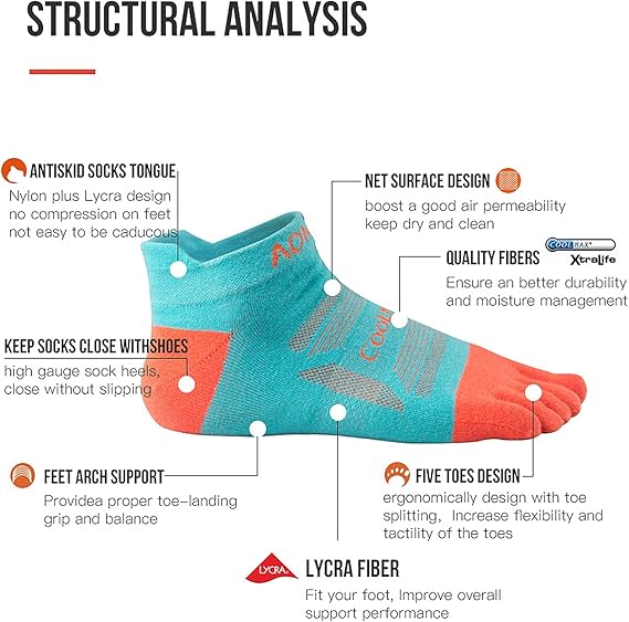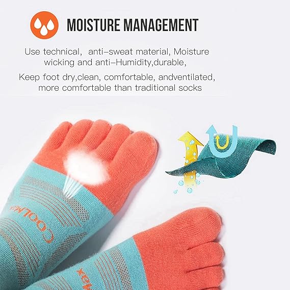 - COOLMAX MATERIAL: 34% Coolmax, 63% Nylon, 3% Lycra, five finger socks with moisture wicking,Keep your feet dry, clean and comfortable