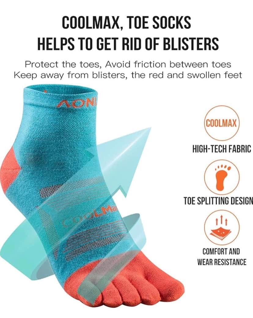Must-Have Summer Socks: Made of 48% Cool-max, 49% Nylon and 3% Lycra. These toe socks feature moisture-wicking synthetic fibers that are breathable and fast-drying, keeping your skin cool and fresh.